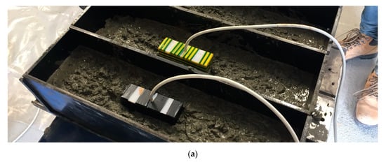 Embedding two devices into large cement-paste-based sensing blocks of Size 2 dimensions was completed to show effectiveness even when embedded. Figure 11a,b shows the embedding of the device. Measurement results were taken when the sensing blocks were submerged in a tank of CaOH liquid solution to aid the curing process and prevent the added chloride ions in the cement-paste-based sensing blocks from leaching out. The results from embedding the device are shown in Table 4.