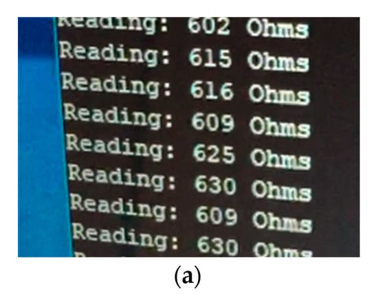 These results show a clean and effective solution for the measurement of chloride ingress, ready for the implementation into the novel composition of cement paste. Testing the device in water connected to a computer is pictured in Figure 12a–c. The test was conducted using basic tap water and demonstrated the sensing devices ability to measure non-concrete materials. The results from testing five times in water are displayed in Table 7 with results averaged after 10 samples.