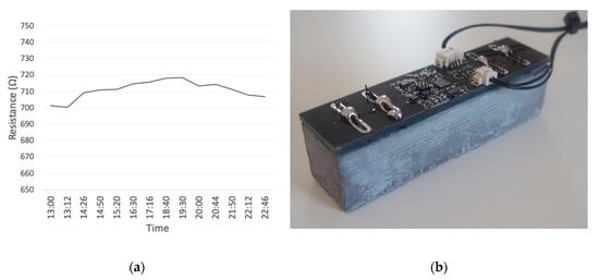 Running the sensing device on one of the small blocks for 10 h shows the voltage deviation over time for continuous monitoring. The higher resistance values are due to leaving the blocks out for an extended period from when the blocks were first manufactured. This is due to there being no water ionic conductivity, required for detecting chloride ingress. The results from this test are displayed in Figure 13a. Figure 13b shows the setup of the device with the sensing element mounted directly to the sensing device. The system was powered and communicated to a computer for 10 h.