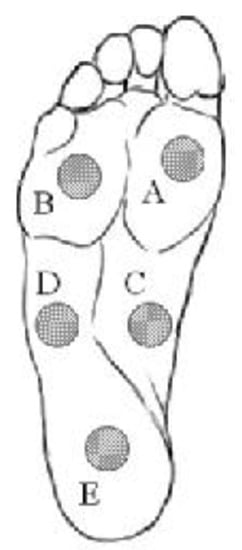 A group of researchers from Latvia proposed several systems that use the smart sock in applications where locomotion parameters are analyzed [17]. These smart socks include sensors that, by being knitted in the sock, reduce to a minimum the discomfort to the user. In one of these studies, two types of locomotion were analyzed: walking normally (with a velocity of 3 km/h) and walking at a brisk pace (with a velocity of 6 km/h) while wearing the smart sock system. The five sensors embedded in the sock were placed as shown in Figure 1: Sensors A and B in the front part of the foot, C and D – in the middle, and E – in the rear part (more exactly, on the heel, as stated in [17]). However, please note that in [17], there was a discrepancy between the graphical placement of the sensors (see Figure 1) and the explanations provided.