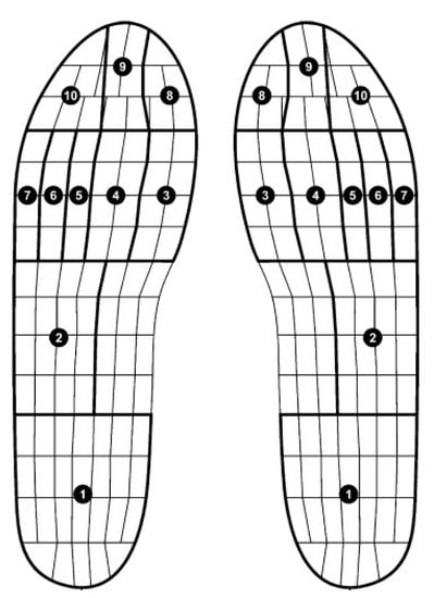 - Putti, A.; Arnold, G.; Cochrane, L.; Abboud, R. The Pedar® in-shoe system: Repeatability and normal pressure values. Gait Posture 2007, 25, 401–405. [Google Scholar] [CrossRef]