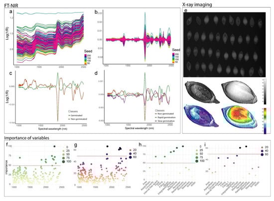 Quality classification of U. brizantha seeds based on Fourier transform near-infrared (FT-NIR) spectroscopy and X-ray imaging: (a) raw NIR spectra; (b) spectra preprocessed to establish predictive bands and reduce the effect of noise; (c) mean spectra for classes of germination capacity and (d) seed vigor; (e) X-ray images and 3D projections of seeds based on grayscale; (f) importance of wavelengths in FT-NIR based on the PLS-DA model for classes of germination capacity and (g) seed vigor; (h) importance of X-ray image descriptors based on the LDA model for classes of germination capacity; and (i) PLS-DA model for classes of seed vigor.