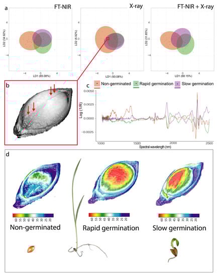 (a) Score plots of the linear discriminant analysis (LDA) for quality classification of U. brizantha seeds based on germination speed using Fourier transform near-infrared (FT-NIR) spectroscopy, X-ray imaging, and the combination of FT-NIR spectroscopy and X-ray imaging. (b) Radiographic image of one seed showing mechanical damages (red arrows). (c) Characterization of spectral absorbance signature of seeds with different vigor level. (d) 3D projections of X-ray images based on grayscale for classes of non-germinated seed, rapid and slow germination speed.