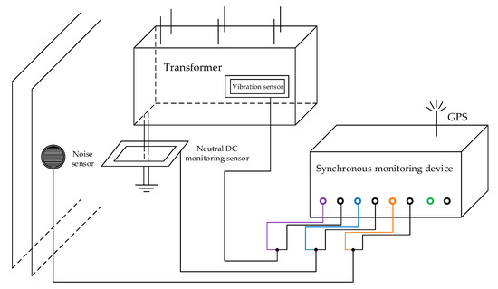 When the DC bias of the main transformer occurs, the neutral point DC of the main transformer increases, the vibration intensifies, and the abnormal noise is obvious [7]. Therefore, to accurately identify DC bias hidden danger, the transformer DC bias synchronous monitoring device based on neutral point DC, vibration, and noise is widely used [8,9].