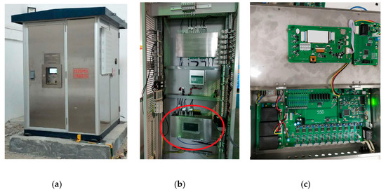 The hardware of the DC bias monitoring device of the transformers: (a) device appearance; (b) synchronous monitoring device; (c) physical picture of internal hardware.