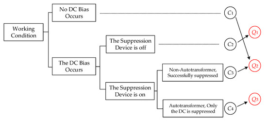 By comparing the characteristics of the above transformer DC bias monitoring data, it can be seen that the data characteristics of working conditions C1 and C3 were the same. Therefore, we classified the two conditions into the same class. The final classification result, Q1–Q3, is shown in Figure 4. The first type Q1 was that the transformer had DC-bias and the suppression device was off. The second type Q2 consisted of two cases: the transformer had no DC-bias, the non-autotransformer had DC-bias, and the suppression device was on. The third type Q3 was that the autotransformer had DC-bias and the suppression device was on. The data characteristic rules under different working conditions are shown in Table 2.