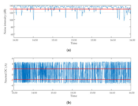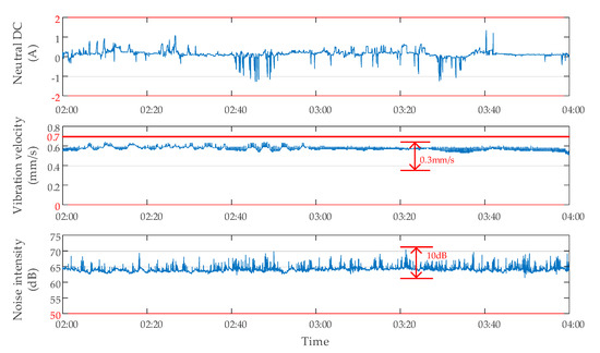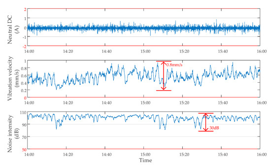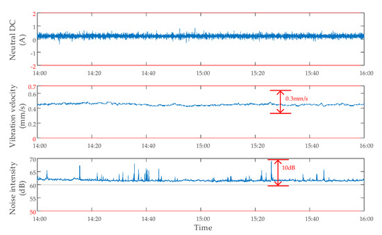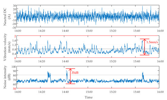 When DC bias of transformer occurred, the use of the DC bias suppression device had a great influence on the monitoring data [25,26,27]. To obtain the data characteristics when the DC bias occurred and the suppression device was off, the tests were carried out. During the operation of the subway from 14:00 to 16:00, DC bias of the transformer occurred, and the suppression device was off. The monitoring data of neutral point DC, vibration, and noise of a transformer are shown in Figure 7. The neutral point DC fluctuated within ±90 A. Vibration velocity was within 0 and 2 mm/s, and the maximum variation amplitude did not exceed 1.5 mm/s. The noise intensity was within 50 and 110 dB, and the maximum variation range did not exceed 35 dB.