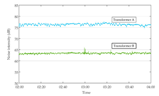 The noise intensity of transformer A and transformer B in the period from 2:00 to 4:00.