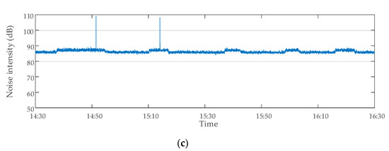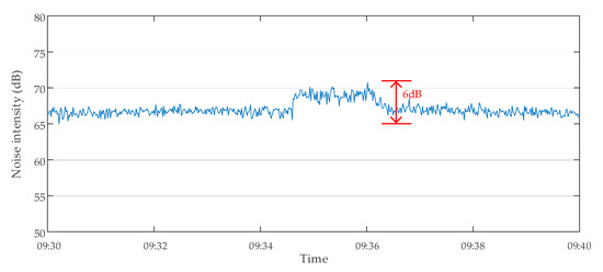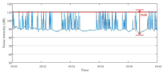 The method proposed in this paper was used to evaluate the data validity of the transformer E. The monitoring data of transformer E were abnormal on 18 October 2019. The monitoring data of transformer noise intensity at 9:30–9:40 are shown in Figure 15. A large number of intermittent continuous anomalous hopping data occurred in the noise intensity data. These data were judged invalid because they exceeded the upper limit H1 (110 dB) in Criterion 2 and the data singularity tolerance value (10%) in Criterion 4. The monitoring device was presumed to have malfunctioned because of a large amount of invalid data. The inspection of the noise monitoring device of the transformer showed that there was indeed a serious fault. After the device was replaced on 4 November 2019, the monitoring data of the same period were analyzed again the next day using the same method. The results showed that there were no longer many invalid data, as shown in Figure 16. The results of two data validity analyses of transformer E are shown in Table 5.