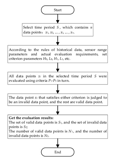 This criterion is used to evaluate all data points in the selected time period S. If the value of data point xi exceeds the upper and lower limits of the measurement, that is, Equation (1) is satisfied, then the data point xi is judged to be an invalid data point.