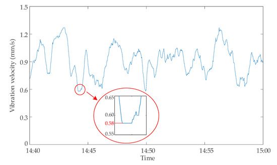 The method proposed in this paper was used to evaluate the data validity of the transformer C in the regional power grid. There was a period of continuous identical data lasting for 12 s from 14:40 to 15:00 on 28 April 2020. The vibration velocity monitoring data of the transformer from 14:44:08 to 14:44:19 were 0.58 mm/s, as shown in Figure 12. According to the setting of the continuous same tolerance value N in Criterion 3, the continuous same number was greater than the tolerance value N = 10. Therefore, the data points of this part were judged as invalid data points. After querying the network communication records of the monitoring system, it was found that a temporary data communication failure occurred during this period, which led to the abnormal situation shown in Figure 12. Through the analysis of this case, it can be seen that the validity evaluation method of the DC bias data proposed in this paper can well identify the data anomalies that are difficult to observe artificially.