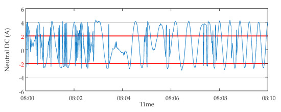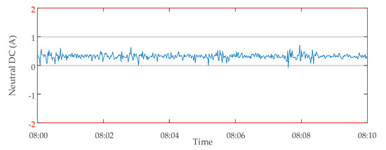 The method proposed in this paper was used to evaluate the data validity of the transformer D. The monitoring data of transformer D were abnormal on 30 October 2019. The monitoring data of the neutral point DC at 8:00–8:10 of the transformer are shown in Figure 13. When the transformer was a non-autotransformer and the suppression device was on (working condition Q2), a large amount of neutral DC data were judged invalid because they exceeded the upper limit H2 (2A) or the lower limit L2 (−2A) of Criterion 2. Through the analysis of these invalid data, it was found that the cause of this part of invalid data could be attributed to the abnormal zero drift of data. The monitoring device was presumed to have malfunctioned because of a large amount of invalid data. The inspection of the neutral point DC monitoring device of the transformer showed that there was indeed a serious fault. After the device was replaced on 4 November 2019, the monitoring data of the same period were analyzed again the next day using the same method. The results showed that there were no longer many invalid data, as shown in Figure 14. The results of two data validity analyses of transformer D are shown in Table 4.