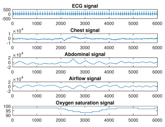 Many other SA diagnostic methods based on multiple bio-signals have been proposed. Al-Angari et al. [22] showed that the feature extraction from abdominal and thoracic respiratory effort signals, SaO2, and ECG signals could be applied with an SVM to detect apnea events. Two effort signals were used to compute the phase-locking value. Features were computed, including the standard deviation and the mean of the time between beats (RR intervals), the normalized and absolute powers in the high-frequency band, the low-frequency and the very-low-frequency bands, and the power ratio of the low-frequency band to the high-frequency band. Standard deviations and means of SaO2 were also computed. For classification, SVM classifiers were used with these features. A benchmark method for automatic detection SA was established based on ECG, airflow and SaO2 in Reference [23]. Each signal was decomposed by the wavelet transformation and the depth was 14. At every detail level, the mean, variance, and energy were computed. An ANN and other classifiers were compared and features from different signals were the inputs fed into classifiers. The best model was an ANN applied airflow signals. In addition, in SaO2 and ECG signals, features were used to train a linear discriminant model in Reference [24].