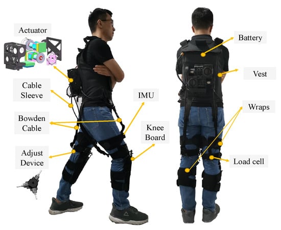 Our soft exoskeleton system comprises six parts on each leg: actuation module, Bowden cable, a Bowden cable adjusting unit, load cells, Inertial Measurement Unit (IMU) sensor, and soft wraps as shown in Figure 1. There are four fixing points on the vest and three on the leg wrap of each leg connected through the Bowden cable as shown in Figure 1. One end of the Bowden Cable is connected to the motor through Cable sleeve, and the other end is connected to Adjust Device. The part of the Bowden Cable exposed in the middle is wrapped by soft textiles to separate the signal cable and Bowden Cable. Upon actuating the motor, a tensile force is generated in the Bowden cable, which produces a torque at the fixing point. The initial length of the Bowden cable can be quickly adjusted according to the height of the wearer through its adjusting unit. The IMU sensor (WT901C485, Shenzhen wit-motion Technology, China), installed on the wraps of the hip, is used to collect data related to the angle, velocity, and acceleration of the thigh movement. The load cell (GJBLS-WS, Bengbu Zhongcheng Sensor, China), whose one end is connected to the Bowden cable and the other end to the fixing point, is used to monitor the change in the force in real-time and then to return the force data to the micro-controller. Other components of our soft exoskeleton include a nylon vest used to fix the actuation system, two binds to wrap the subject’s hip, and two Knee Boards (carbon fiber boards) to transmit the extension torque to the knee and hip joints.