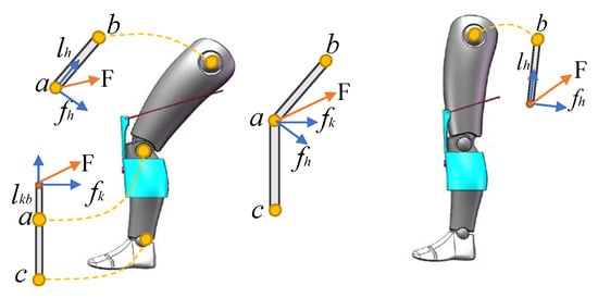 where and are, respectively, the moments in the hip and knee joints; the values of , , and in GC are obtained from the work in []; and and are, respectively, the lengths of the thigh and the Knee Board.