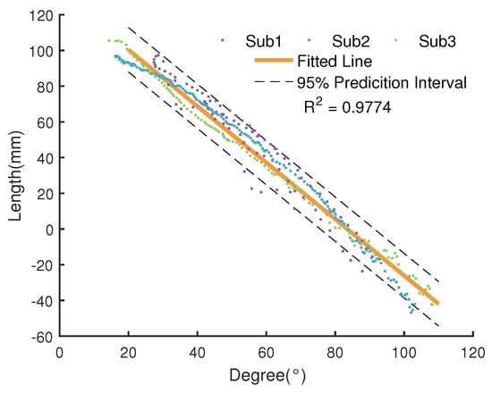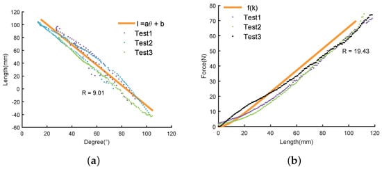 where is the hip angle; l is the length of Bowden cable; a and b are two coefficients of this model, whose values are obtained through curve fitting as and , respectively. It is noteworthy that the relationship between the length of the Bowden cable and the hip angle is similar for both front and back of the hip. Therefore, for the sake of simplicity, the data in this section are taken from the back side of the hip joint.