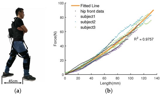 In order to understand the dynamics of the soft exoskeleton in our system, we develop a relationship between the tension and the length of the Bowden cable based on a series of experiments conducted on the same subjects. The experimenters wear an exoskeleton and stand on the flat ground while keeping a 45 cm distance between their feet. The experiment subjects wear an exoskeleton and stand on the flat ground while keeping a 45 cm distance between feet, as shown in Figure 4a. The actuator retracts the Bowden cable while holding the initial standing posture when actuator retracts Bowden cable to analyze the relationship between the change in the length and the tension of the Bowden cable. The sampling time was set as 0.01 s. The initial tension in the Bowden cable was made 2 N and its initial length was recorded as 0 mm. In order to ensure the safety of the subjects, we restricted the maximum tension and the maximum length to within 150 N and 150 mm, respectively. We performed the experiments in both front and back sides of the hip joint. The experimental conditions were kept the same in both front and back sides, except that the posture of the legs was reversed.