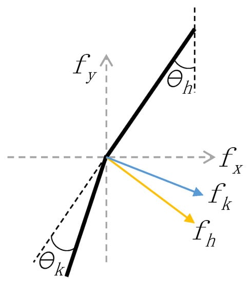 The moments of flexion and extension in the lower limb joint were analyzed in [,]. We constructed three assistance strategies, one for each of uphill, downhill, and level ground scenarios, based on the moments in the hip and knee joints on different terrains. In order to make the assistance strategies applicable in our soft exoskeleton, we maintained the moments in the hip and knee joints as per Section 2. The force on the knee board is shown in Figure 5. Where the black line is the abstract of thigh and shank, and represent the sagittal coordinate system; and is the force in hip and knee joints, respectively; and and are the angles of hip and knee joint, respectively. The force in the Knee Board can be expressed by Equation (4).