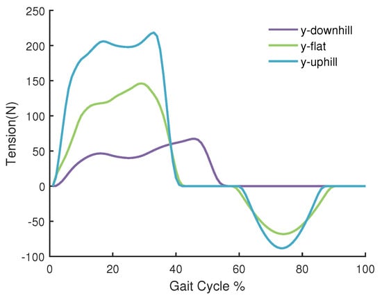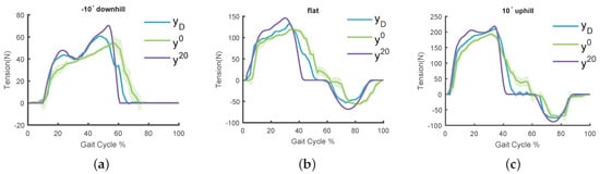 To evaluate the performance of force tracking in our soft exoskeleton, we conducted experiments with three healthy adult males ( years old; kg weight; cm height) walking on a treadmill. The experiments were performed on the treadmill at a speed of 4 km/h. Three slopes of and were set in order to simulate the scenarios of uphill, downhill, and flat ground. The assistance strategies for different terrains have been introduced in Section 3. The subject walked on the treadmill for five minutes at each slope. The tension in the Bowden cable is collected periodically.