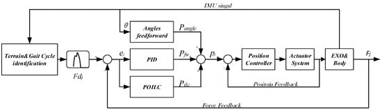 The control architecture is depicted in Figure 7, where the index j denotes iteration of the learning scheme, denotes the desired force in the jth iteration, and is the motor position of the controller output, which are constructed by the position of feedback control , POILC feedforward , and angle feedforward . The relationship between the motor position and the Bowden Cable length is proportional, that is, . Where the p is the motor position, l is the length of Bowden Cable, and k is the coefficient. The position controller is embedded in motor driver, which can drive the motor to the specified position. is the output force from the soft exoskeleton, which feedback to the input terminal through load cell and compare to the input desire force to get the error . Then, the hip angle in the hip joint is obtained through IMU. The terrain’s type and the gait cycle time can be obtained through the link of terrain and gait cycle identification.