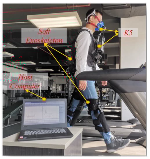 While a subject is walking with the soft exoskeleton, an actuator-driven Bowden cable is used to generate assistance in the lower limb. The metabolic rate is measured through K5.