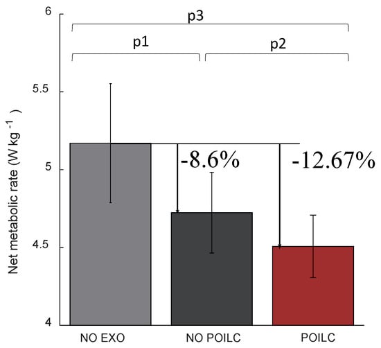The tracking error of the desired force is decreased by adding the POILC method. In order to verify the performance improvement of the soft exoskeleton due to the reduction in tracking error, a comparative test is conducted on flat ground. The reduction in metabolic rates in the condition of with ILC and without is as shown in Figure 11. The results demonstrate that the performance of the soft exoskeleton is improved by reducing the tracking error. The net metabolism is reduced more when the POILC method is applied. The net metabolism decreased by 8.6% without POILC method and 12.6% with POILC method, respectively.