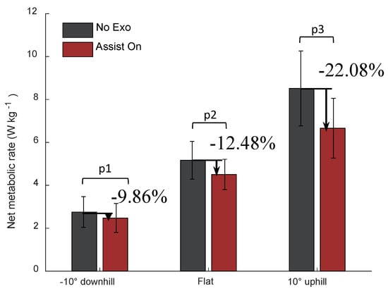 The metabolic rates of the subjects in each experiment are shown in Table 3. The results demonstrate that the metabolic rate was highest in the uphill mode and lowest in the downhill mode, as predicted. The reductions in the metabolic rate in the downhill and flat ground modes were considerably similar, which was dramatically different from the case of uphill. The average reductions in the net metabolic rate were , , and compared to the case of not wearing the soft exoskeleton in the downhill, flat ground, and uphill, respectively, where the absolute reductions were 0.28 W/kg, 0.72 W/kg, and 1.60 W/kg, respectively.