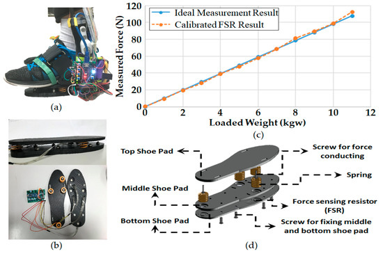 Figure 2a shows the photo of the sensing, computing and communicating module. To get an accurate GRF measurement, an intuitive way is to place as many pressure or force sensors as possible on the sole and sum up all the sensor measurements. However, calibrating numerous sensors is very time-consuming, costly, and therefore intractable. Instead, we place four force sensing resistors (FSRs) between two 3D printed polylactic acid (PLA) shoe pads at the locations, with reference to [], as shown in Figure 2b,c shows the calibrated measurement of an FSR and compares it with the ideal one. Only the calibration result of one FSR is shown here; however, all FSRs were calibrated individually before they were installed in the sensing module. To distribute the user’s weight on these FSRs, we add the third shoe pad which connects to the second one through four pairs of screws and springs on top of the FSRs (see the explosion drawing in Figure 2d. The screws concentrate the weight on the FSRs while the springs surrounding the screws prevent the FSRs from overloading. The measured data are collected and pre-processed in an Arduino microcontroller. Then, the results are transmitted to the CCU through serial communication channels in real time.