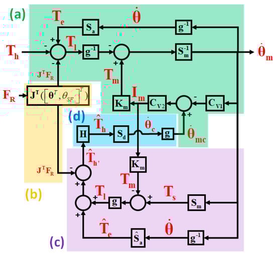 As shown in (1), is the user’s torque to HES, which indicates how the user would like to move the HES. Hence, we propose to estimate and treat it as the user’s motion intention. Then, the joint velocities are determined accordingly. Based on the dynamic model (1) and (4)–(7), or the block diagram of Figure 4a, we proposed in our previous research [,] a disturbance observer (DOB)-based torque estimator for estimating . The proposed torque estimator is: