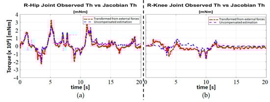 The uncompensated user’s joint torque estimation (red long dashed line) and the equivalent joint torque due to the external force (blue short dashed line): (a) right hip; and (b) right knee.