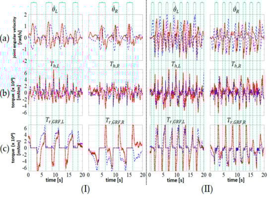 The joint-related information of the walking experiments under different admittance parameters. (I) ; (II) ; (a) the joint angular velocity ; (b) the estimated user’s torque ; and (c) the equivalent joint torque due to GRF. Red dot-dashed lines represent the hip joint and the blue dashed lines represent the knee joint. Subscripts R and L denote the right-leg and left-leg related data, respectively.