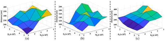Three-dimensional plot of walking distance for a series of experiments as Nd and Dd vary from 1000 to 5000: (a) Subject 1; (b) Subject 2; and (c) Subject 3.