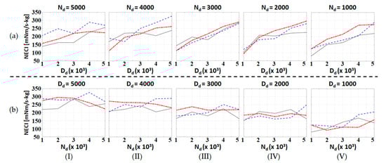 Plot of NECI for a series of experiments with different admittance parameters: (a) Nd is fixed and Dd varies; and (b) Dd is fixed and Nd varies. The red dot-dashed line, blue dashed line and the black dotted line represent the data of Subject 1, Subject 2 and Subject 3, respectively.