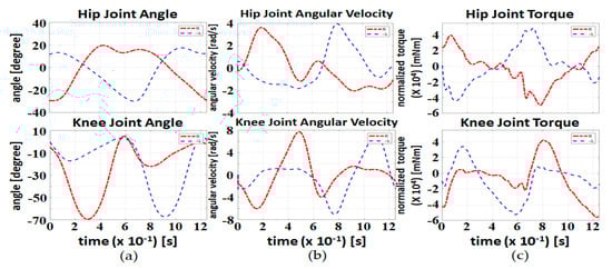 Joint data of one gait cycle obtained from the open source software: (a) joint angle; (b) joint angular velocity; (c) normalized joint torque. The red dot-dashed line and blue dashed line represent the data of the right leg and the left leg, respectively.