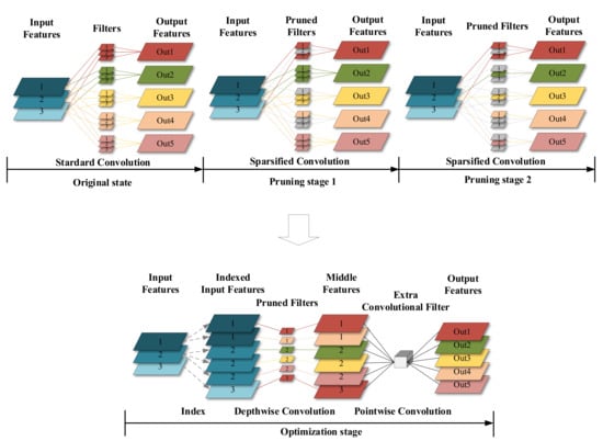 To integrate the pruning methods, we develop the two-stage training framework to divide the training task into picking and combining. In the first stage, the LdsConv picks out the most valuable input features and applies more filters to them by pruning technique. In the second stage, the additional pointwise convolution combines the output of the first stage and produces the output features. The idea of division of labour and progressive working has been reflected in computer vision. For example, the two-stages detection framework [40] divides the task into region proposed stage and classification as well as location stage. Cascade RCNN [41] further refines the second stage into three parts and each part is based on the front one. Similarly, we adopt this idea in the convolutional operation and thus divide the training task into picking up useful filters and mixing up the results of picking up. The relationship between two stages is progressive and inseparable. The two-stage training process simplifies the training task for each stage and finally improves the efficiency of the model.