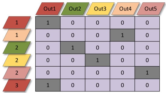 Initial value assignment of the example shown in Figure 1. The left set of parallelograms represents the middle features. The numbers in these parallelograms mean the index in the input features. The upper set of parallelograms represents the output features. The same color between the left parallelogram and the top one means that they are matched in picking stages. The value in the matrix means the initial value of the additional convolution.