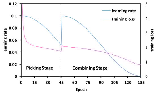 The cosine shape learning rate and a typical training loss curve trained on ImageNet. The vertical gray bar in the figure marks the end of picking stage and the begin of combing stage.