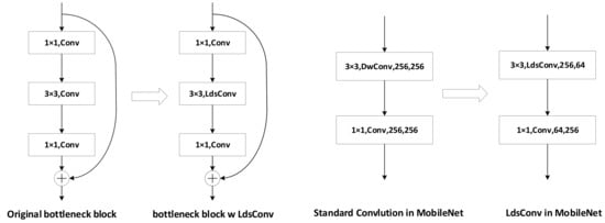 The replacement of original convolutional filters with LdsConv. Left: The replacement in ResNet. We directly replace the 3 × 3 convolution with our proposed LdsConv in the bottleneck block. Right: The replacement in MobileNet. We replace the original 3 × 3 convolution and reduce the number of output channel of the LdsConv and input channel of the sequent 1 × 1 convolution.