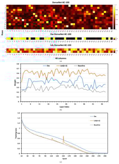 (a): Norm of weights of three models in Cifar 100. The block with darker color has less value of norm. The vertical and horizon axis represent the height and width of the weight matrix expect the Lds-DenseNet-BC-100 in which we arrange it in this way for alignment. (b) The curve between 48 3 × 3 convolutional layers in dense blocks and the average norm of weights for three models. (c) The curve of convergence speed for three models.