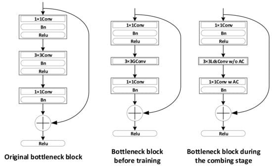 To investigate the compressing ability of our proposed LdsConv, we adjust the bottleneck block with LdsConv in the ResNet to a extreme state as shown in Figure 6. To this end, we remove the Bn and Relu layers after the 3 × 3 group convolutional layer before training. When the combination stage begins, we integrate the additional pointwise convolution (AC) with the sequent 1 × 1 convolution by the matrix multiply operation since no non-linear operation exists between them. When the model formally enters the combing stage, we only train one 1 × 1 convolution after every LdsConv. In Table 4, we compare the LdsConv with the existing compression methods including ThiNet [30], NISP [56] and FPGM [57]. We use ResNet50 as the baseline, replace the standard convolution with the LdsConv, and reduce the number of parameters further by setting the pruning factor to 1 and combing the additional pointwise convolution with the sequent 1 × 1 convolution. We also set and , which lengthens the training epochs, in order to relieve the negative effect of extremely compressing. Compared with these pruning methods, our method, denoted as Lds-ResNet50-extreme, not only improves the accuracy outperforming all other compared methods but also reduces the FLOPs by 40.9%. Furthermore, the real inference speed of Lds-ResNet50-extreme is 42 batches (16 images per batch) per second with the practical evaluation on GPU Nvidia RTX 2080 compared with the 28.9 batches per second on the baseline of ResNet50. We can obtain nearly 1.5× speed up without special hardware support.