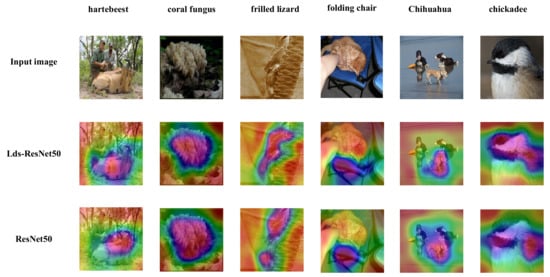 Grad-CAM [58] visualization results. We compare the visualization results between our Lds-ResNet50 and ResNet50. The Grad-CAM visualization is calculated for the last convolutional outputs. The ground-truth label is shown on the top of each input image.
