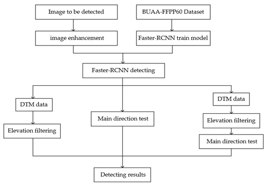 The method proposed in this paper consists of three parts: (1) the preliminary detection on enhanced images by Faster R-CNN, (2) the elevation filtering using local DTM, (3) the main direction test. The overall process diagram is given in Figure 1. Considering that the condensing tower is detected in former studies, its experimental results are preserved as comparative references. Furthermore, although the thermal infrared data are helpful for detecting the working chimneys, the resolutions of commonly accessible data are too low. Therefore, they are not used in this paper.