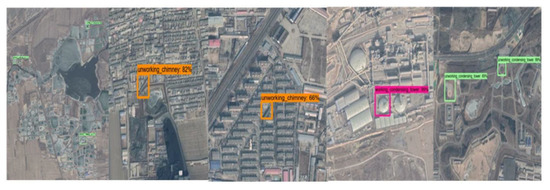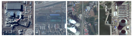 The dataset used in this experiment is BUAA-FFPP60, which is collected and produced by Beihang University. The dataset is composed of chimneys and condensation towers distributed in the 123-km2 power plant in the Beijing–Tianjin–Hebei area. There are 318 original pictures, of which 31 are test pictures. The remaining 287 pictures are mirrored or rotated by 90° to generate 861 training pictures. The pictures come from Google map with a resolution of 1 m, ranging in size from 500 × 500 to 700 × 1250 pixels. The working state of the chimney and condensation tower is determined by whether there is smoke. The four labels in the dataset are working chimney, non-working chimney, working condensation tower, and non-working condensation tower. Figure 4 shows some examples of dataset.