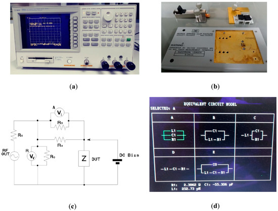 Electrical impedance analyzer and model used. (a) Impedance analyzer used (HP 4395A). (b) Clip fixture used (HP 16092A) and accessories. (c) Measurements’ block scheme for the impedance analyzer and Device Under Test (DUT). (d) Equivalent circuit model used (model A), with a resistor R1, a capacitor C1, and an inductance L1 in parallel, and other available options at the impedance analyzer.