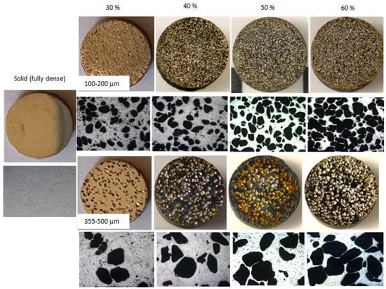 Macro- and micrographs of the titanium substrates studied. Macroscopic and microscopic appearance of the different types of titanium substrates studied (100–200 μm, upper images, and 355–500 μm, lower images), at different contents (30%, 40%, 50% and 60% vol.), in comparison with fully dense samples.