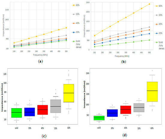 Figure 3 shows the electrical impedance measured for the porous discs of 100–200 μm and for the porous discs of 355–500 μm, at different frequencies (from 150 to 500 MHz). As can be seen, in both cases the electrical impedance of the samples increases with increasing frequencies, and there are significant differences between the samples with different porosity volumes and the fully dense samples. In Figure 3c,d, box and whiskers plots for each of the measurements of both groups of samples, at all frequencies, are shown, indicating the median, lower, and upper quartiles, and highest and lowest observations.