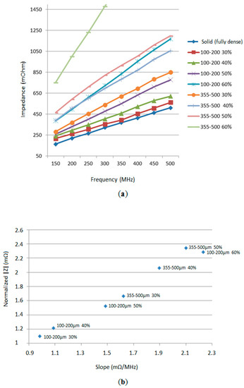 In accordance with the experiments reported in [10], higher pore size resulted in higher impedance. An increasing pore size limited electron mobility and therefore increased the electrical impedance of the sample. However, on the contrary to the experiments reported in [10], where the pore size had a minor influence on the electrical conductivity of porous titanium and Ti6A14V, our experiments showed an important difference between the sizes of 100–200 and 355–500 μm. As can be seen in Figure 1, the impedance measured for 355–500 μm is approximately double the impedance measured for 100–200 μm, for most frequencies and volumetric porosities.