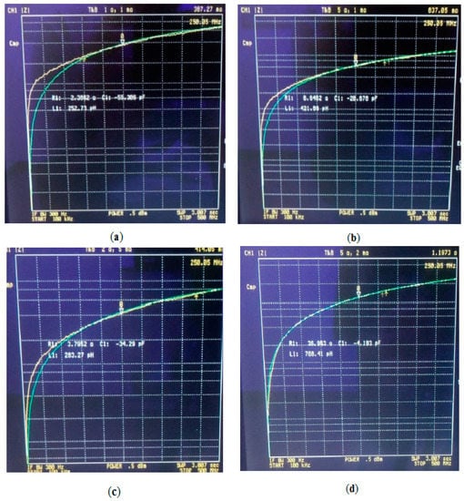 The mean experimental values obtained for R1, L1, and C1 for the selected model, in each of the samples, are shown in Table 2. In addition, as shown in Figure 5, there is a good match between the experimental values and the theoretical values calculated by the Hewlett–Packard 4395A impedance analyzer, with the different values for R1, L1, and C1, at the different frequencies. As can be seen in Figure 5, there is a good match in all cases, especially at higher frequencies. For the case of size of pore of 355–500 µm and 60% of porosity volume, the theoretical model fits very well the experimental values for all frequencies.