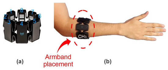 The commercial MyoTM armband was chosen for data acquisition, and is presented in Figure 2a. This device is widely used in gesture recognition research [46,47]. MyoTM has eight equidistant channels, with 200 samples/s, 8-bit resolution from ADC (Analog to Digital Converter), and wireless communication via Bluetooth [48]. Signal acquisition is made through dry stainless-steel electrodes and there is a 3-axis sensor unit with an accelerometer, gyroscope, and magnetometer. MyoTM was placed on the right forearm of subjects (Figure 2b), which is the orientation needed to place channel 3 on the flexor carpi ulnaris muscle. All the subjects were right-handed and the gestures were performed only with the right hand.