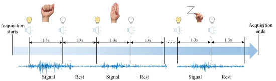 Signals from 12 subjects (10 men and two women), with an average age of 23.2 ± 2.4 years, were acquired (for more information, see Appendix A). The subjects were healthy, without myopathies or muscle diseases in the upper limbs. Figure 3 presents the signal acquisition process. A graphical interface was developed to inform subjects what gesture should be performed and the next gesture in the sequence. When the subject was required to perform a gesture, a light indicator turned on. The indicator turned off when the subject was required to rest their forearm muscles. In each change, a buzzer sounded. The time interval for each gesture was defined with a frequency of 45 beats per minute (bpm), equivalent to 1.3 s between performing each gesture and rest state. In each trial, the subjects performed the 26 gestures; this sequence was repeated 20 times for each subject.
